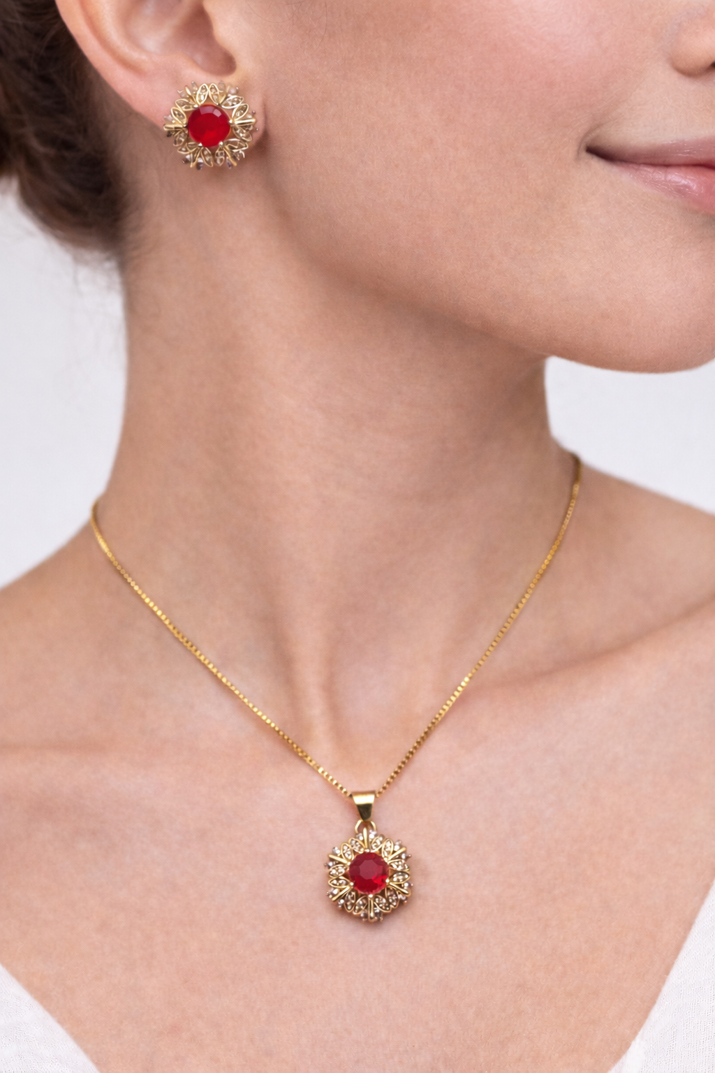 Conjunto Colar e Brinco Rosa Cereja- Folheado a ouro 18k